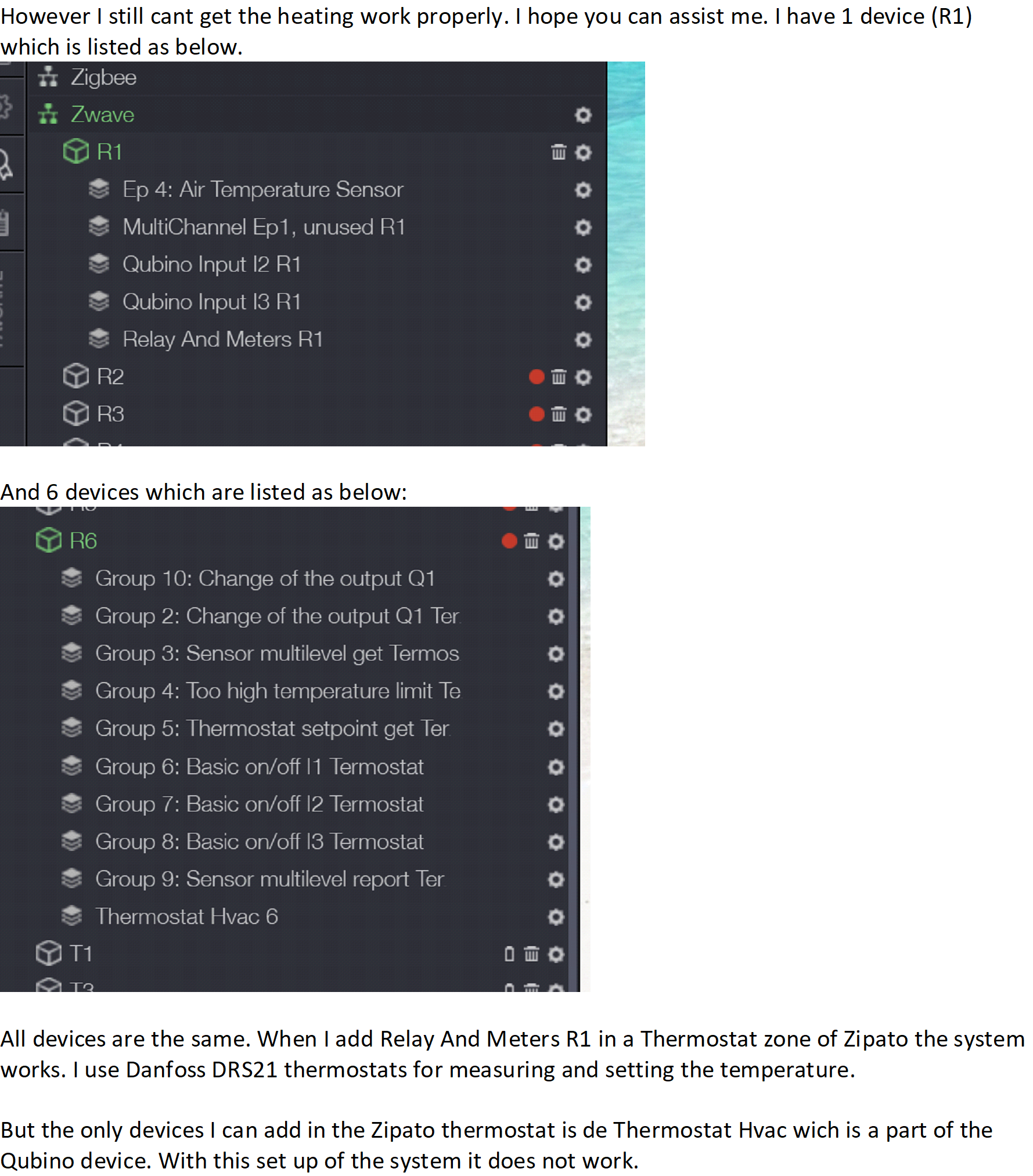 The only devices I can add in the Zipato thermostat is de Thermostat Hvac wich is a part of the Qubino device. With this set up of the system it does not work.