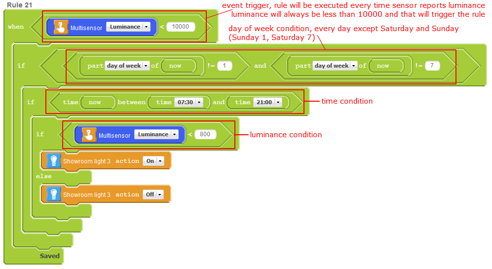 Rule2 during Monday ,Tuesday, Wednesday, Thursday and Friday from 7:30 to 21:00 if there are more than 800 lux light should turn off