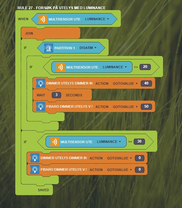 The goal is to use a multisensor outside to activate the outdoor lights when my alarm is switched off. when the luminance is below a given value