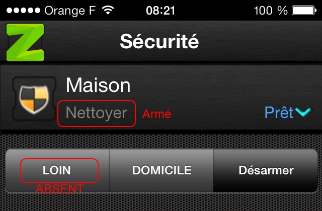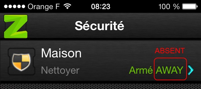 * On the right it is written "Armé AWAY" for "Armed AWAY". "AWAY" should be translated here as "ABSENT" like on the web.