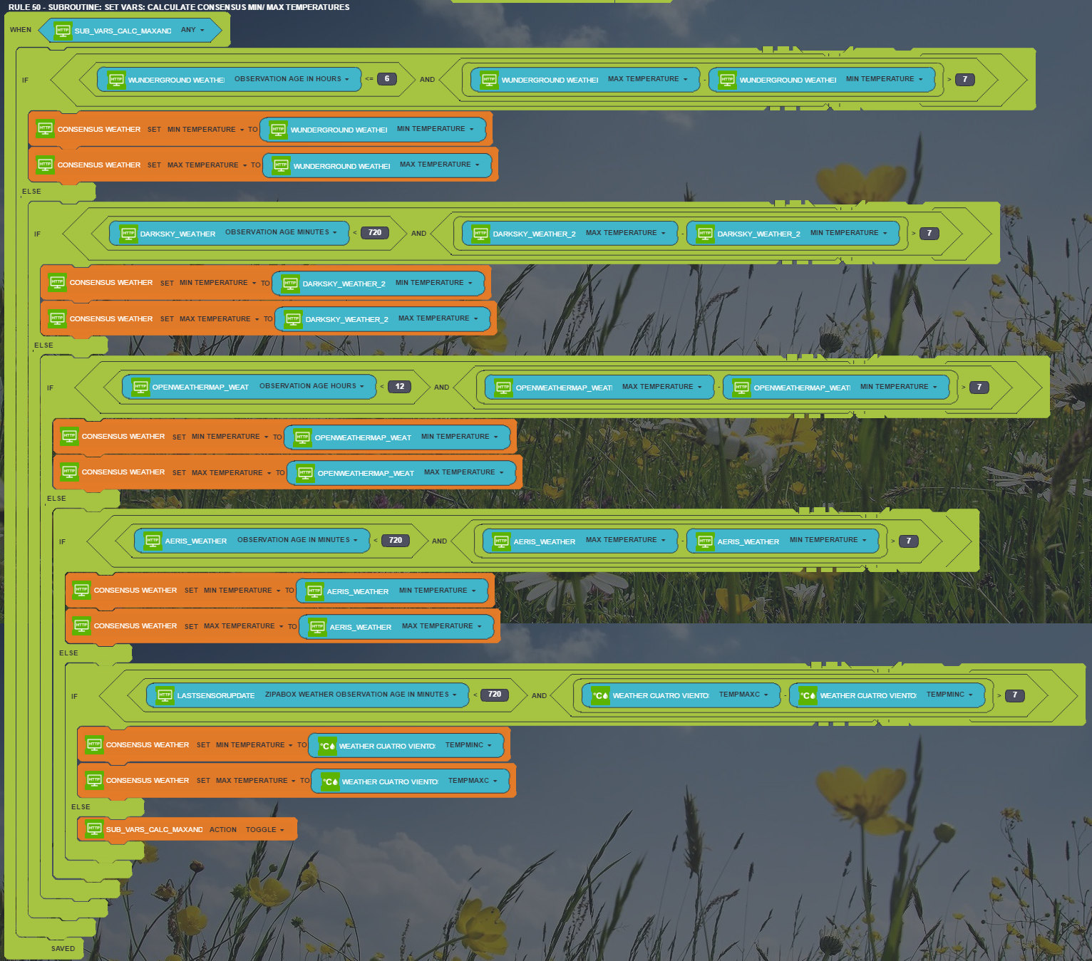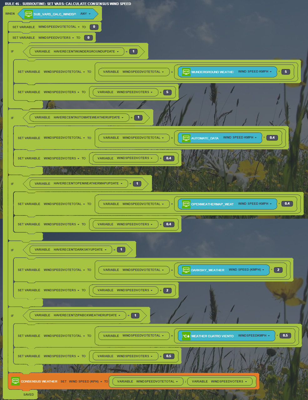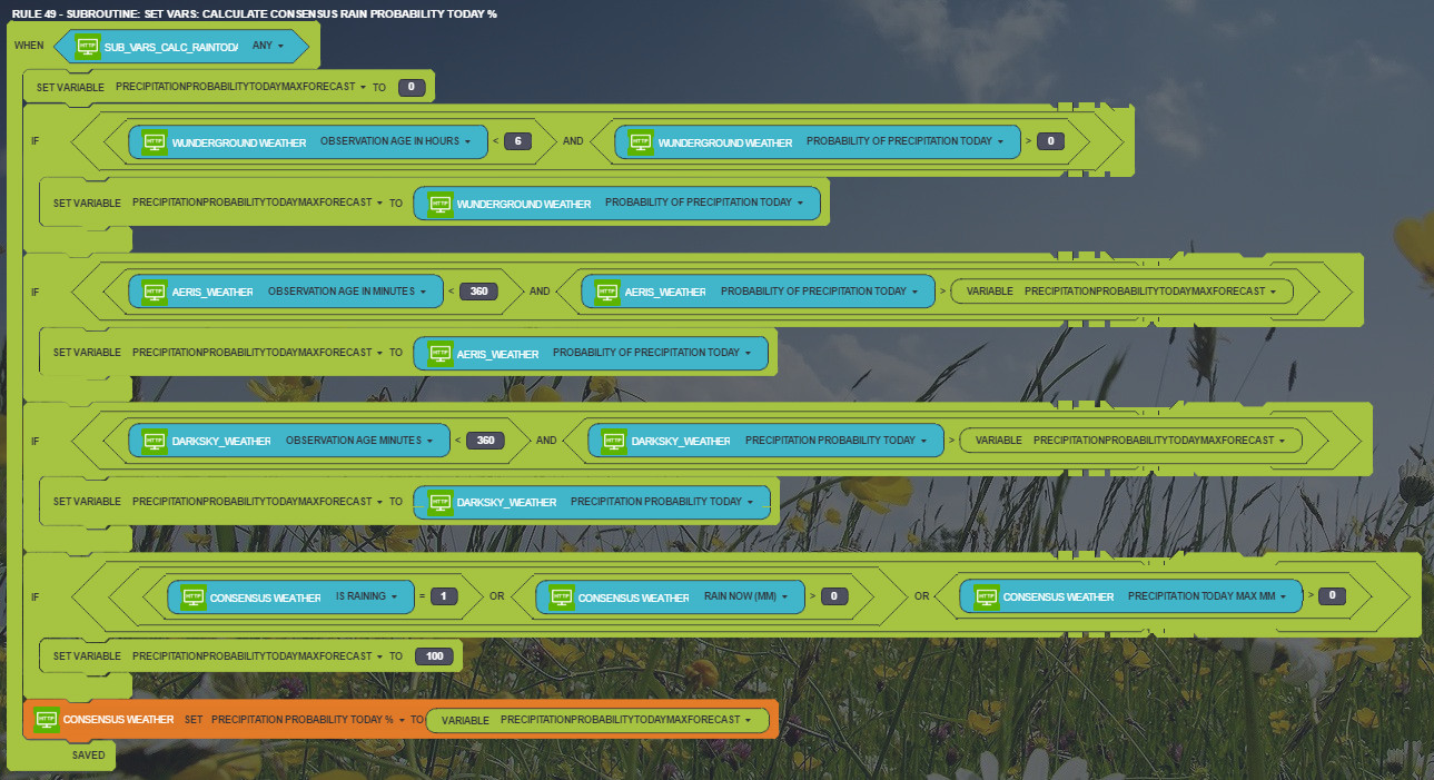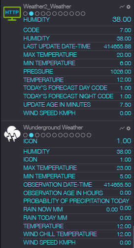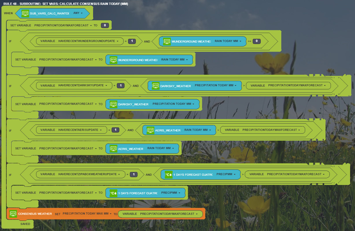 For some weather values, I just take the source I consider to be most reliable for which I have a recent update. Wunderground seems to be the most accurate for most of the values, but as with all the weather sources, you need to be careful about null values. Sometimes min and max temperatures are the same, or there's some other obvious error. I try to filter these out in my rules. For other values, I calculate a value incorporating all sources, but weighting the ones I like most.