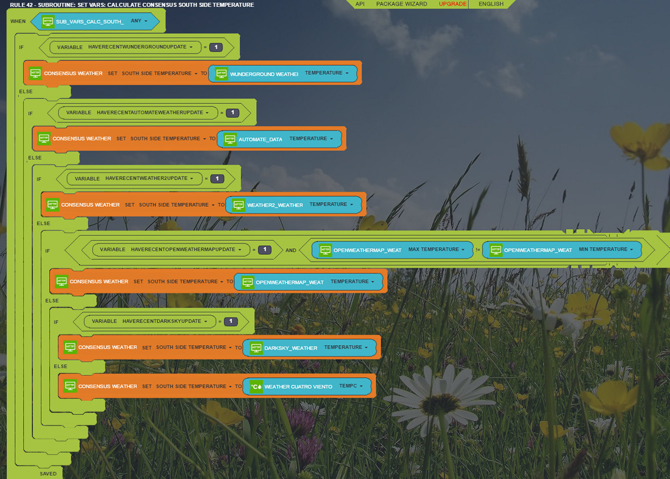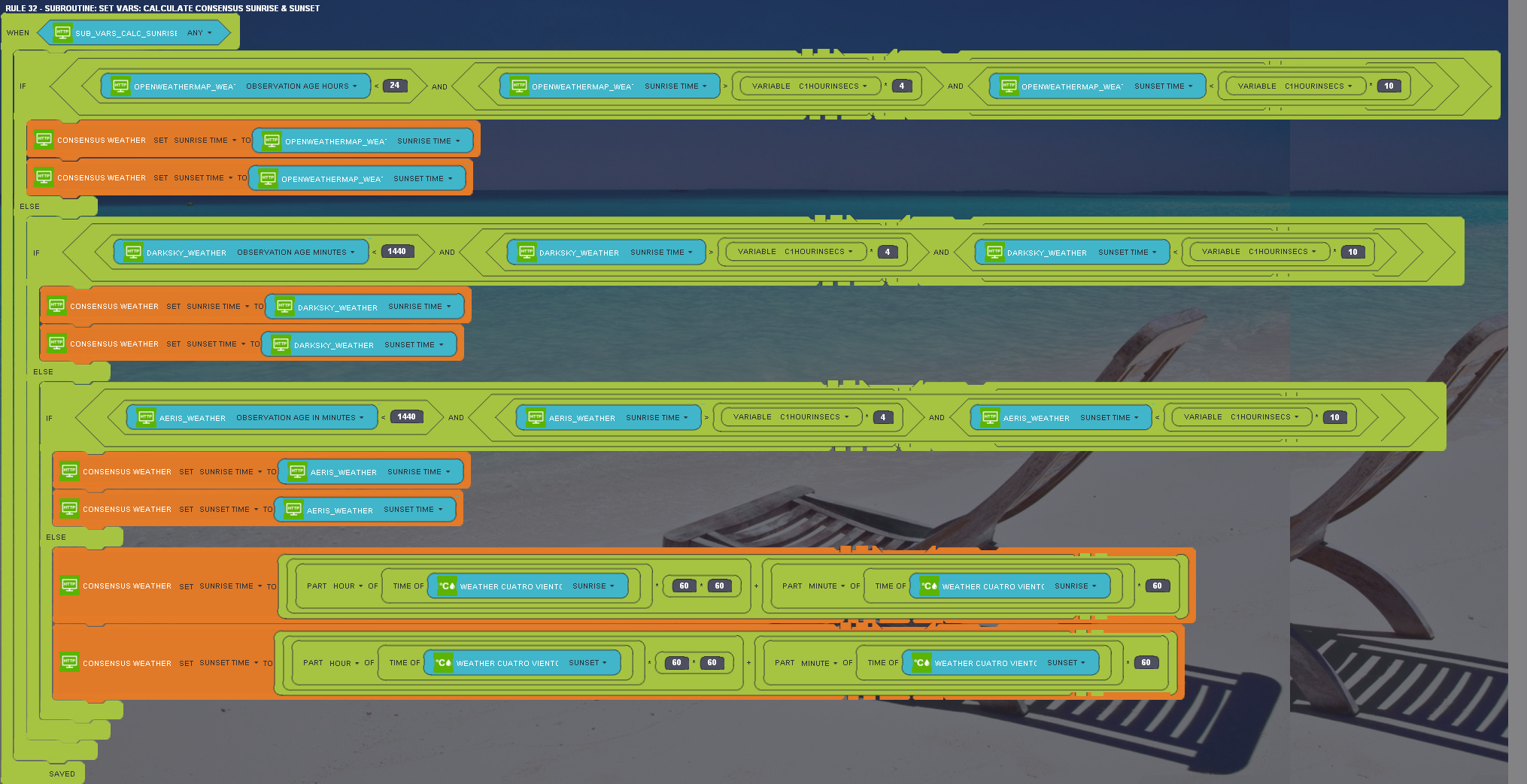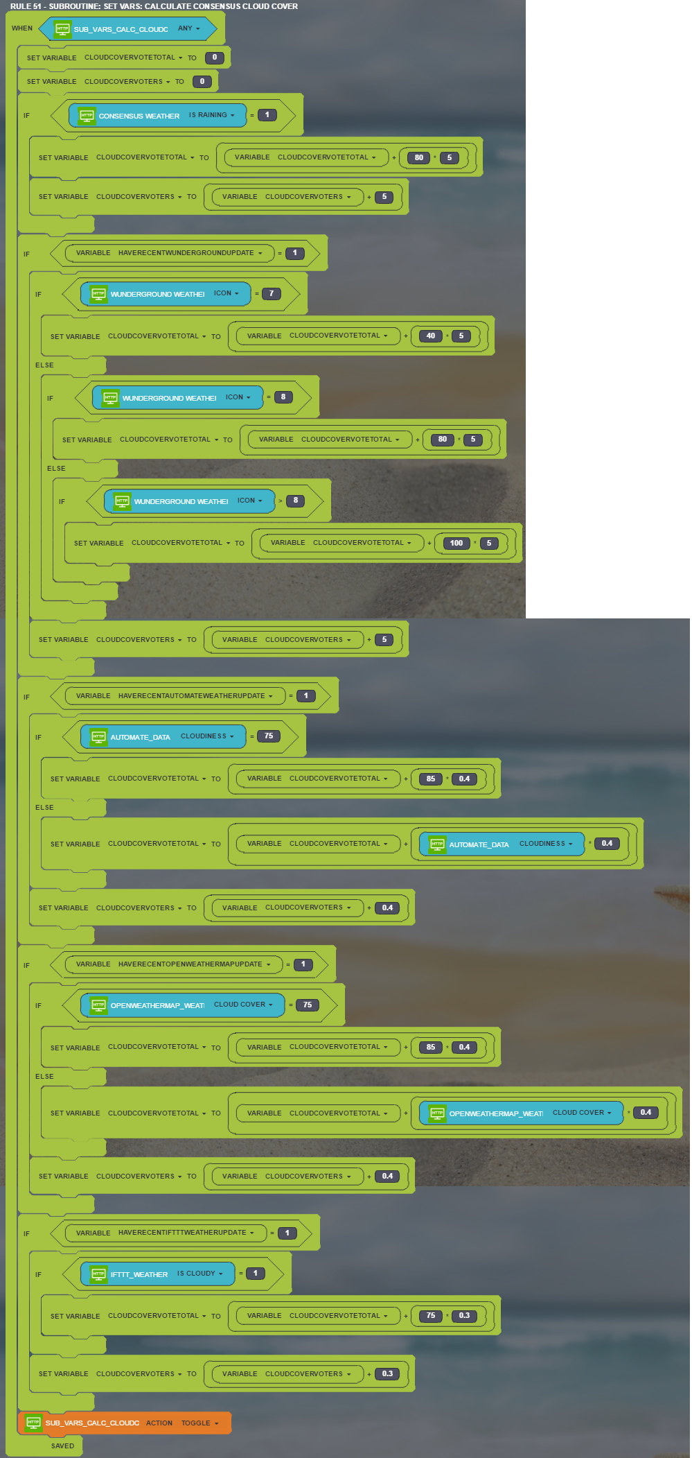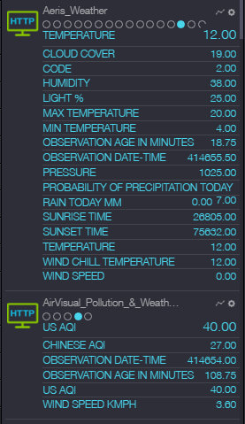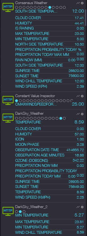 For some weather values, I just take the source I consider to be most reliable for which I have a recent update. Wunderground seems to be the most accurate for most of the values, but as with all the weather sources, you need to be careful about null values. Sometimes min and max temperatures are the same, or there's some other obvious error. I try to filter these out in my rules. For other values, I calculate a value incorporating all sources, but weighting the ones I like most.
