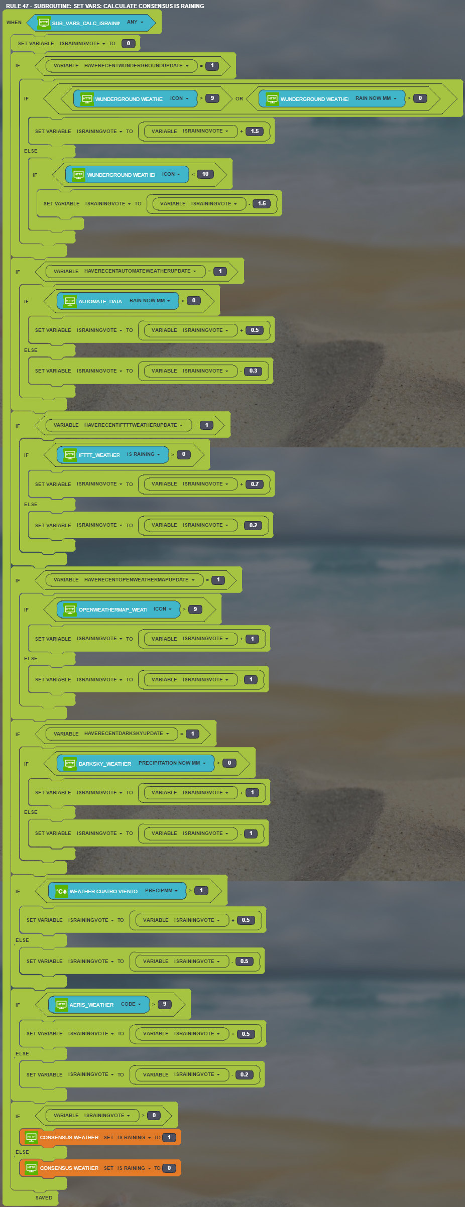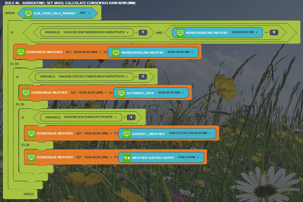 This is the complete Google App Script, minus API keys and so forth. I've marked each missing bit of information with a label showing what's missing. I've also attached the .txt file below for convenience. I also attach the rules that put together the "consensus weather" meter info. Don't pay much attention to the rule numbers - they keep changing as I add and delete rules, so they're not consistent. I took the screenshots at different times.
