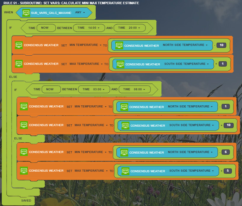 Each rule has a virtual switch to trigger it. Because of my long names, the names are not always visible. "Zipabox Rule 050 - Subroutine - Set vars - Calculate consensus min-max temperatures" calls "Zipabox Rule 051 - Subroutine - Set vars - Calculate min-max temperature estimate" at the bottom. "Zipabox Rule 052 - Subroutine - Set vars - Calculate consensus cloud cover" calls "Zipabox Rule 053 - Subroutine - Set vars - Calculate consensus cloud cover 2" at the bottom.