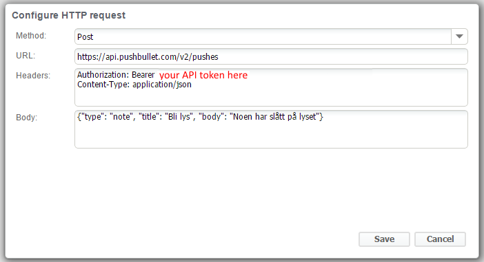 If your goal is to use pushbullet for notification you'll need to specify the bearer token in this way (see attachment)