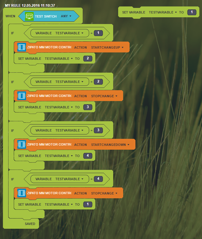 I forgot to say in the video how great full I am to Zipato that this final start working. I have water one year for a stop function of the blinds in rule creator and now I have that. But and my Schneider switch work better and better. I also forgot to tell in the video that my blind is 433 MHz witch means it can not give feedback. But it in facts gives a artificial % valu. So if I run it to the middle of the window the software knows this and remember it. Super convenient.