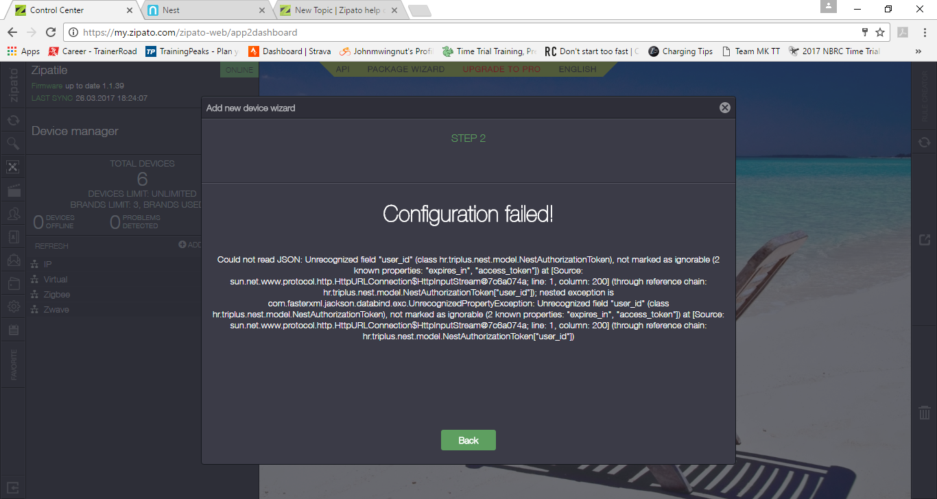 I go to add device and then select nest as the network. I follow the link and get the PIN code, but every time I enter the PIN code into the Control centre its comes up with a long winded error message which I have attached to this post.