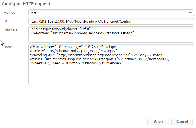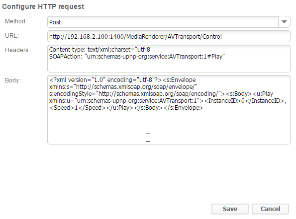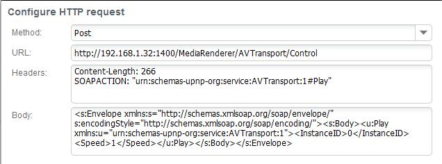 Headers: Content-type: text/xml;charset="utf-8" SOAPAction: "urn:schemas-upnp-org:service:AVTransport:1#Play"
