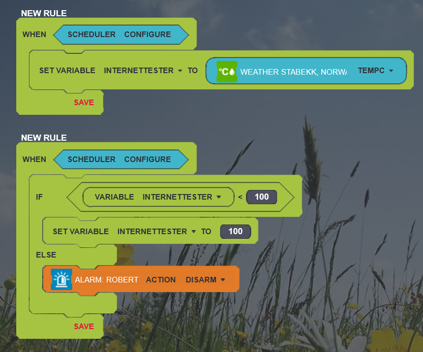 Next, create another rule which runs every TWO minutes. Here, you'll need an IF which checks if the content of variable InternetTemperatureChecker is < 100. If it is, set the value to 100 (so that the other scheduled rule can set it to the correct temperature again when it runs). Inside the ELSE you can do whatever you need done when internet is down.