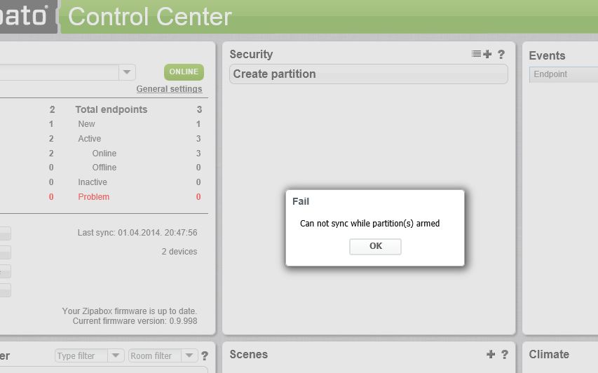When I try to synch. my zipabox I always get the message "Can not sync while partition (s) armed". This started after removing a partition in the security app. How can I fix this?