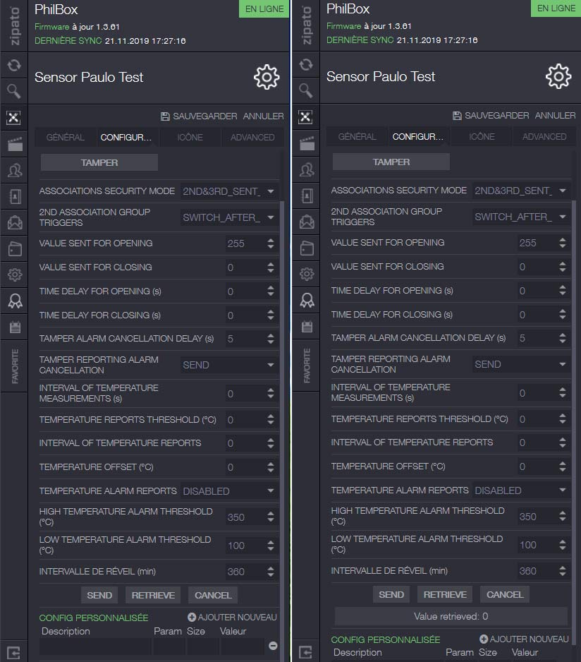 to change configuration parameter, you should firstly press Send button (click on parameter title to open Menu with Send/ Retrieve/ Cancel buttons) and when the confirmation message is received, you can check a new value by pressing Retrieve button.