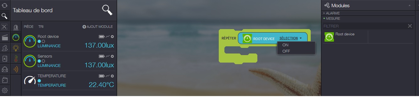 Thanks for your comments but like you can see in my picture, in my list of measures (module) I only see Root device, nothing else .... In my dashboard, I see the temperature sensor. So I can't choose anything else of root device ...