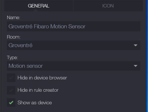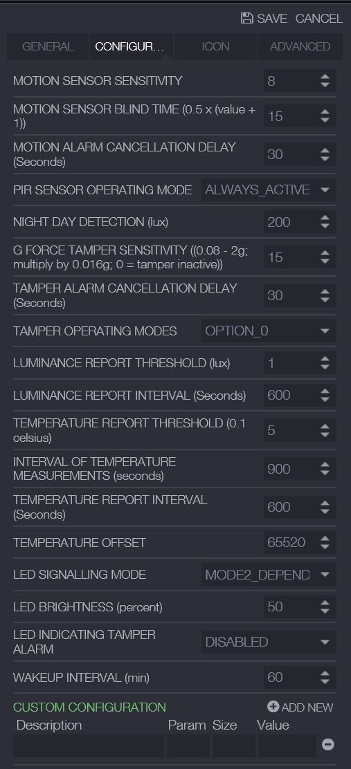 And the sensor "Groventré Fibaro FGMS-001 motion sensor" is configured like this.