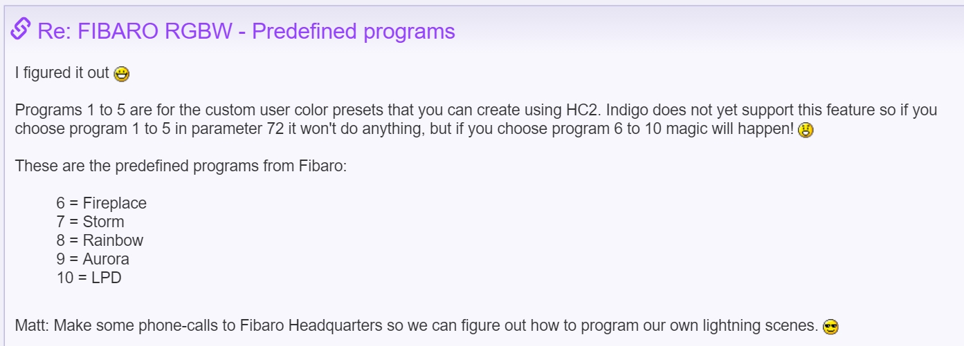 I just setup a fibaro RGBW controler with ikea led strips. Works beautifully, but I would like to know if any progress was made on trigerring programs other than SEND command (nice trick though !).
