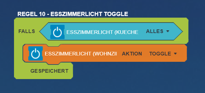 Reason is, that I miss one light switch in my kitchen to turn on the light in the dinning room. Therefore I installed the Fibaro which will trigger the other Fibaro switch to turn on/off the light.
