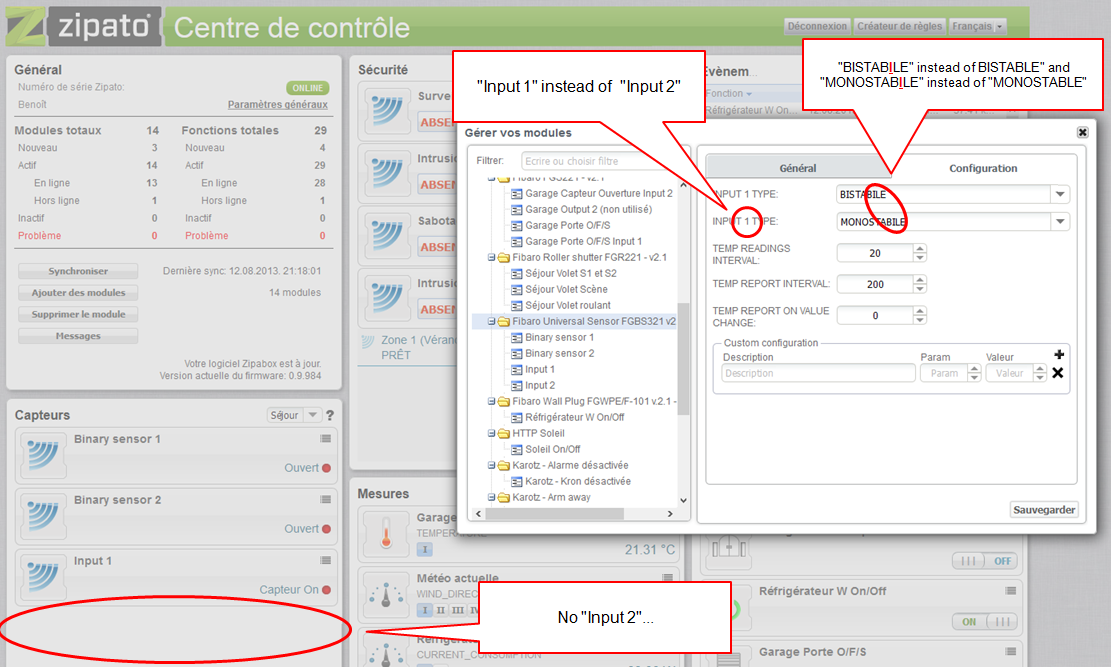 The "Input 2" doesn't appear in the "sensor widget" and when I close the "input 1" contact or the "Input 2" contact, it's the "Input 1" LED on the "sensor widget" that turns green (normal closed).