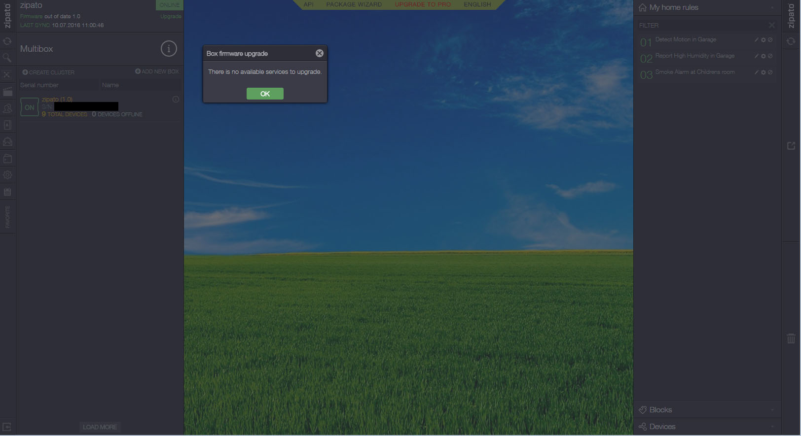The control center informs me that there is a new firmware available, but when I press upgrade, I get a message box saying "there is no available services to upgrade". I've tried official, beta and previous. Always the same thing. Tried also restarting the device.