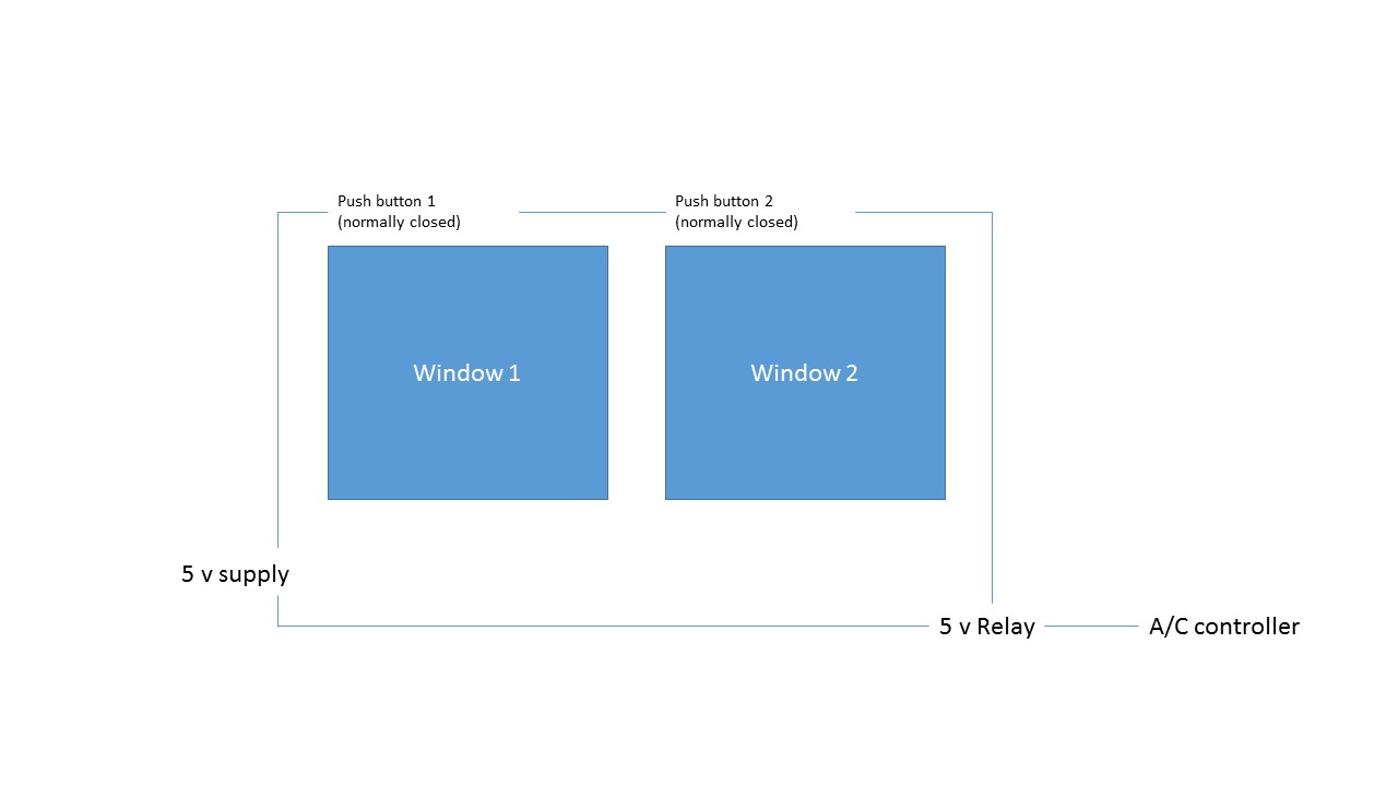 Hi, I have installed "fridge door switches" to detect the opening of several windows. When the windows are closed the circuit is also closed and it activates a relay. When one of the windows is open the circuit opens, the relay goes into idle mode and the air conditioning stops (via a built in interface).
