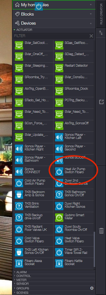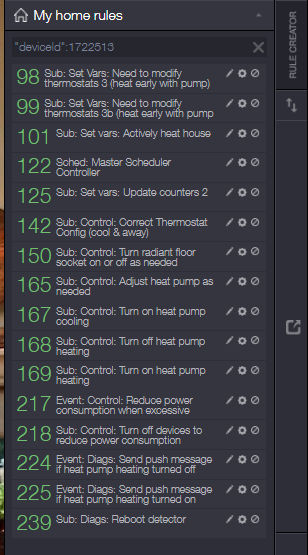 Carlo just brought to my attention an incredibly useful tip. To find where a switch/meter/other device is used in your rules, just drag the device from the "Devices" panel on the right to the "My home rules" panel at the top. This creates a filter which shows only the rules where the device is used. It makes you wonder what other filters we could be using, if we only knew about them.