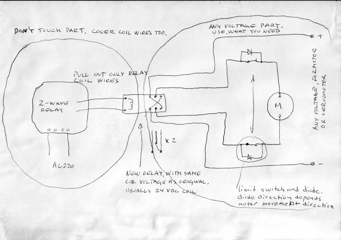 How about, if you go to build mechanical limit switches to the servos and the motor? Then take a any common z-wave relay switch, and change relay to dual changeover relay isolated from original circuit, and use only points to control motor and servos rotating direction. Switch "on" motor rotates towards "open" limit switch, and switch "off" rotates motor to "close". I think, this could be more realiable, than many conversions from one protocol to another.