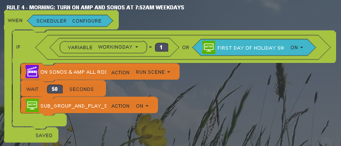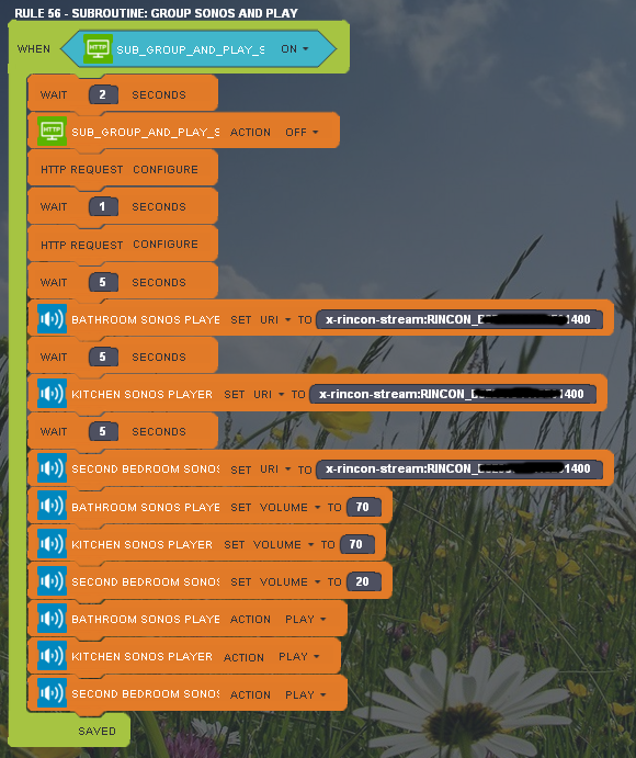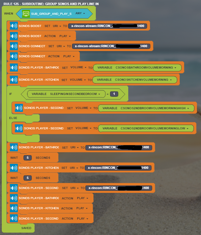 1. One rule turns on the Sonos components via the Z-Wave sockets, waits a bit, and then invokes the "subroutine" that does all the rest.