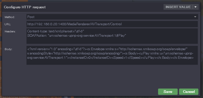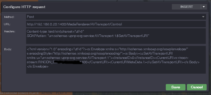 2. The subroutine is invoked via a switch. The first thing it does is turn the switch off (otherwise it can never again be invoked). It must first wait 2 seconds, because otherwise the 2 changes to the switch state happening in rapid succession won't work. It then sends the HTTP request to connect the Sonos Connect to the line-in source, and another to start it playing. Each Play:1 is then set to take the Sonos Connect as the source, their volume is set and they're set to play. The Plays need to be sent the RINCON address, which is the MAC address of the Sonos Connect. You can find this out by going to this URL:
