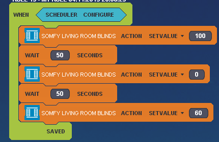 I insert a waiting time of 50 seconds (an arbitrary number) between each step to avoid the blinds getting overloaded by too many commands in quick succession. I don't know whether it's strictly necessary. I tried just setting the blinds to 0, and then the value, but that doesn't work either. It seems you need the 2 previous steps to guarantee that the Zipabox's assumed position and the blinds' real position are synchronised.
