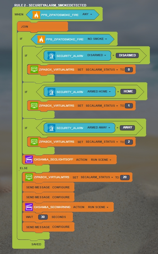 I just read a post where people were having problem setting up a Fibaro smoke sensor. I thought I share an idea how I see a smoke detector should be included in the system (as part of an alarm) - as far as i know this should be done in order to rest in peace that the smoke alarm will indeed alarm you (especially if you remove the noise sensor as zone from your standard alarm) when you are not home.