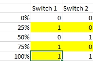 Seems that you have a binary combination for both switches but with the rules you show is not clear to me how the switches are reporting values, I made a table and one combination you use to set two different values, also I'm making an assumption for 100% value of switch 1. Please tell me more about when your switches go ON and OFF.