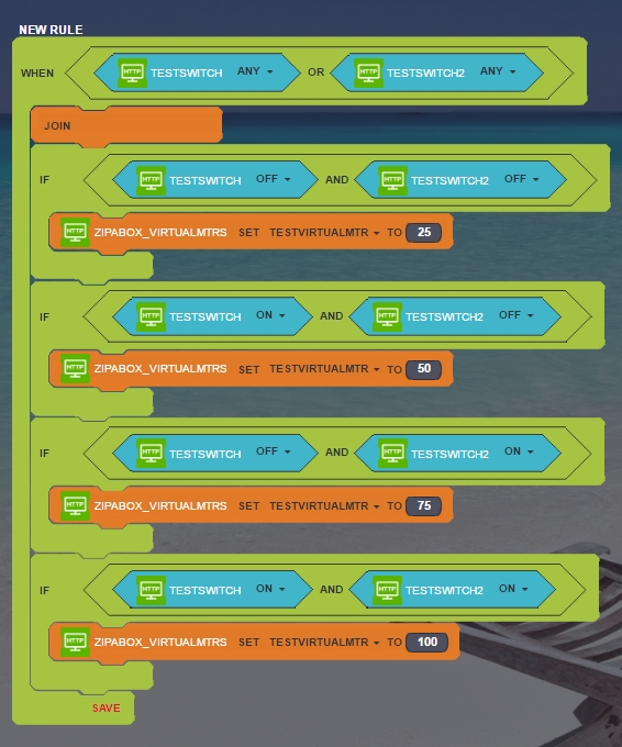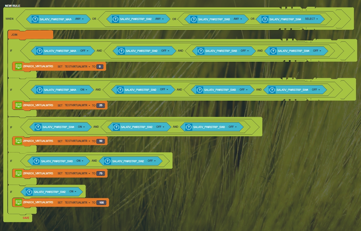 but I dont understand what you want to do, you have the same rule with 2 different action (ie: when the module 1 is on, you have one rule that dimm the level to 100 and another that dim to 50). What you want to archive?
