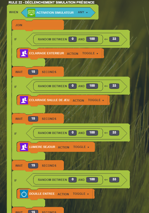 I have divided my home in 4 group of lights and my rule that is triggered by a toggle of the switch 'Change Presence Light' will do a random for each of the groups to toggle their state (as I use 433 actuators I can't check their state). And I have a wait in between so that all lights don't turn on/off at the same time.