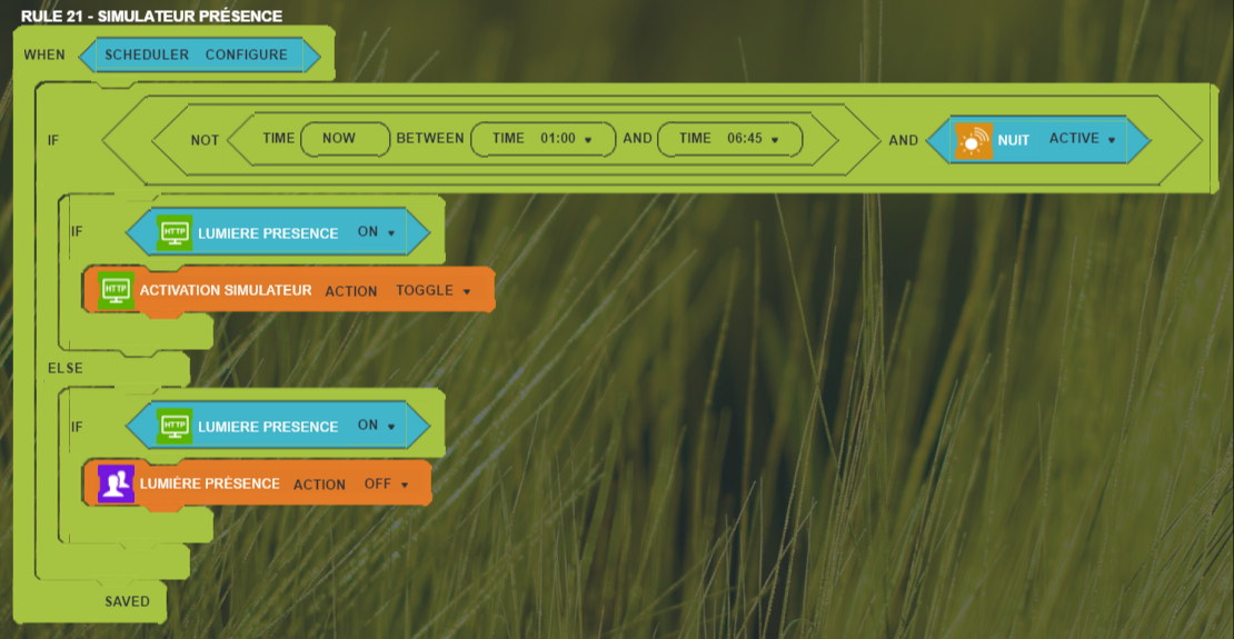 1 scheduler rule that runs every 15 minutes that toggle the virtual switch 'Activate Simulator' if night time and 'Presence Simulator' is on and not between 1AM and 6.45AM.
