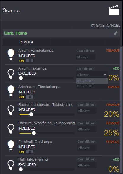 Alt 01 shows how it could be possible to make the setting of the state of each device conditional by selecting if it should be set Allways, Only if On or Only if Off. Choosing Only if Off would change the state of the device only if it has a current state of Off. One potential use of this could be to ensure that you don't change the intensity of the bathroom lighting when the sun comes up if lighting is already on. Of course other options could be added as well.