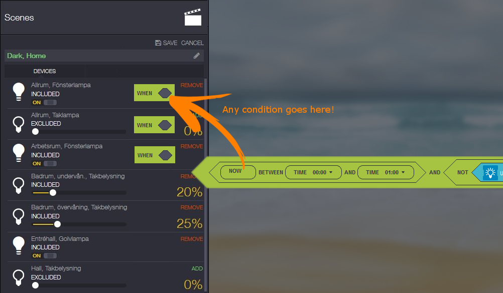 The idea is to be able to set conditions on each device when a Scene is defined. I know that the same thing can be achieved by building rules but I believe that the proposed idea is more user friendly.
