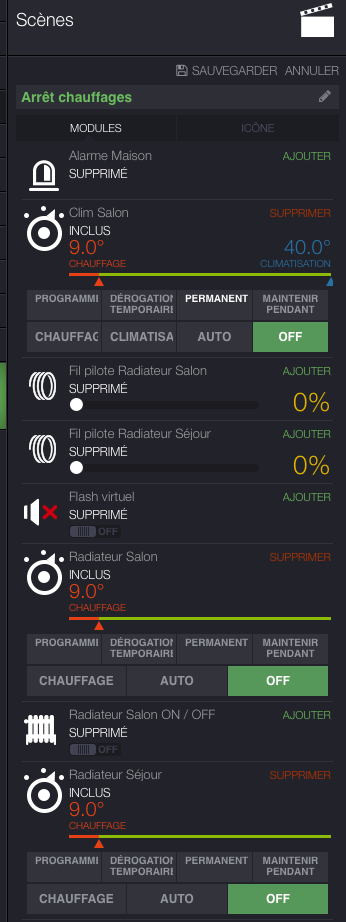 I'd like to report a problem. I build a scene, as described in the attached picture. The scene switch off my three heating system. It works fine with the first device (air conditioner), but not the 2 others (2 electric radiators). I can lower the temperature, but if I click the OFF button (in green on the picture), I can't save the scene. It doesn't work either with the Heat or Auto button.