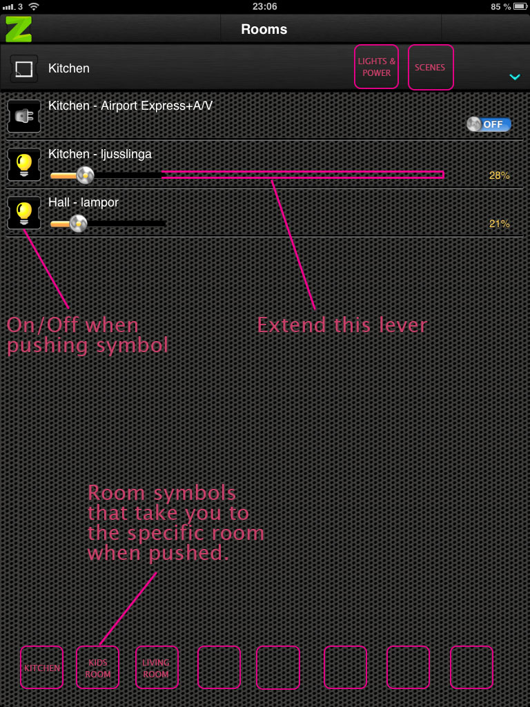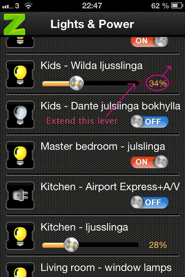 I like what you have going on with Zipabox :-) Haven't used the system very long, but I have a few ideas you should work on with the apps (iphone and ipad). Basically you have to click around to much to reach whatever you wan't to do. Minimize the amount of clicks!Here's a few ideas:- In 'Rooms' --> there should be an icon for each room you have setup that always shows regardless if you are in the main menu or in a room. Now you have to click yourself back and forth all the time you change rooms. Not very smooth.- There should be quick buttons to the main menu choices all the time.- When using the app you shouldn't have to login all the time. Make a setting in 'setup' where you can set the login time. Minutes, hours and days. And have a special login for security instead (or make that a choice of setting in 'Setup' as well). There should also be a setting were you can chose to which screen menu opens when you start the app for reducing clicks.- Lights & power --> the dimmer adjustment lever must be much longer on the ipad. At least double the length, but I should say even longer than that. It's too difficult to adjust to the right level with the short lever now.On iphone it could be a bit longer as well if you move up the percentage notification up to the same text line as the name. That way the adjustment lever can cover all the way to the end of the screen.- Lights & power --> you should be able to turn on/off dimmer lights when pushing the symbol next to the lever. That also goes for the switches.- When pushing 'Scenes' --> app crashes on both platforms (latest iOS)Aril