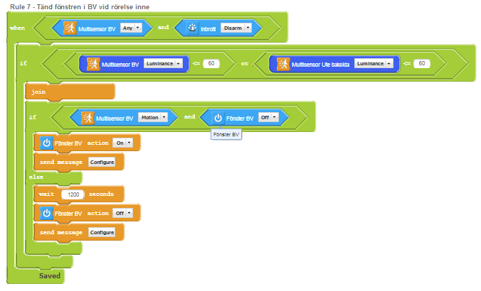 Here is an exampel how to light a room if a precens in the room, but only if the alarm is disarmed and the light insiede or outside is low.