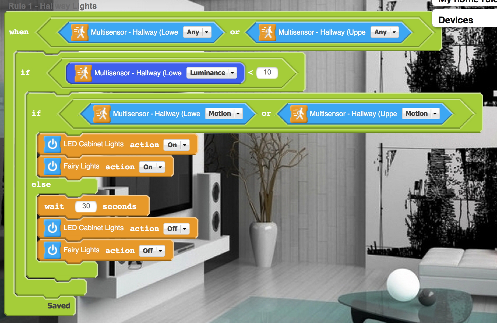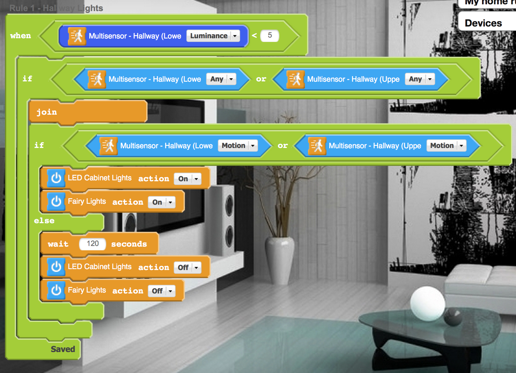 Basically all I want is for when its quite dark (using the downstairs aeon 4in1 sensor) and either the upstairs or downstairs sensors detect motion it activates two lights for a couple of minutes.