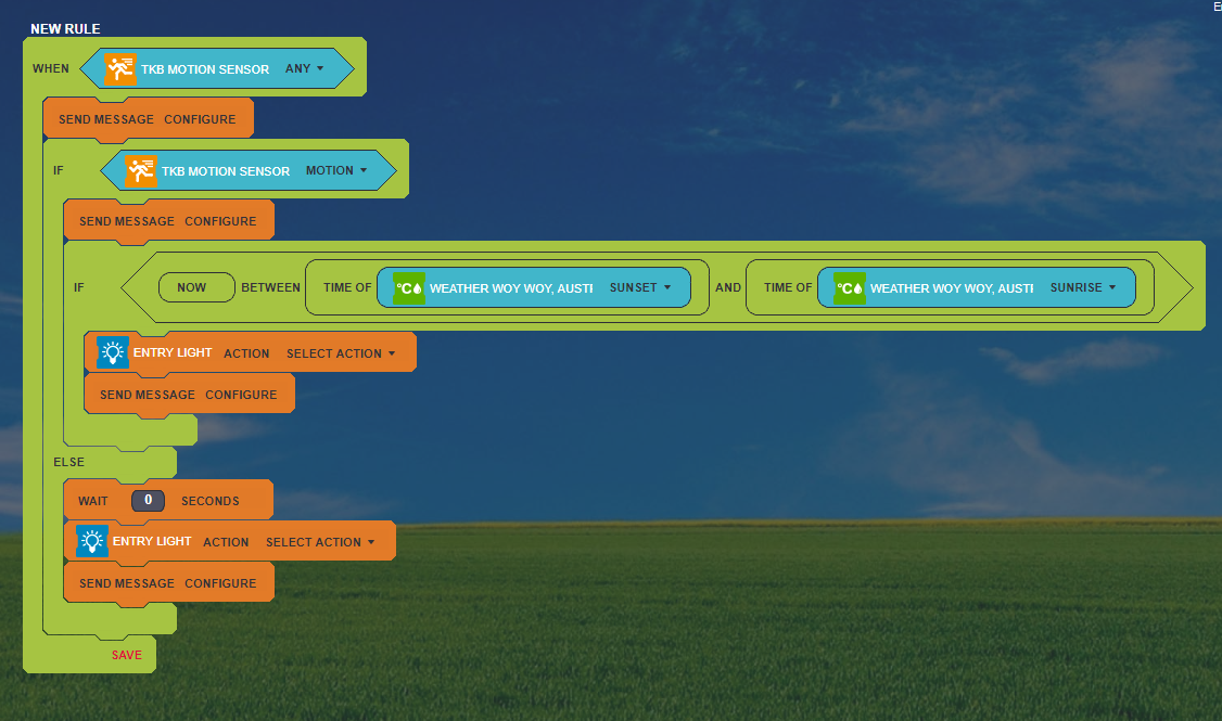 You should change the second if puzzle with the time if puzzle. So that if there is a change in state, 1. if motion is detect if time is correct, turn on light. 2. If there is a change in state, else(now the program asks if there motion, result=NO, then there must be no motion) so turn off light. Currently you else is asking if the time now is not between sunset and sunrise. Not if there is no motion detected.