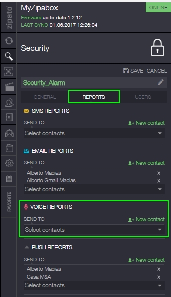 There are two ways of doing it, I would recommend the second. For both cases you have to create contacts for every cellphone or landline you want to call and puchase some Zipato credits (SMS and calls are not for free, SMS is 0.06 US dollar cents and calls are 0.1 dollar cents each), see first picture attached.