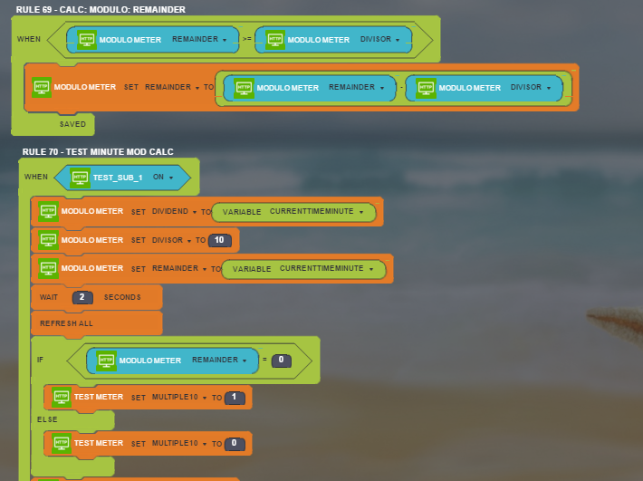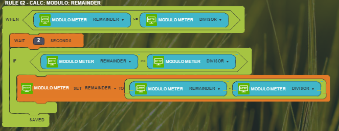But then I stumbled on a way to do it with a rule that acts essentially as a recursive function. First create a virtual meter to hold the values. Actually you only need two: remainder and divisor. You initialise the remainder to the dividend. Then you create a rule that is triggered by a change to the remainder value when that values exceeds the divisor. The rule itself modifies the remainder and thus the condition that triggers it, invoking itself repeatedly until you get the remainder.