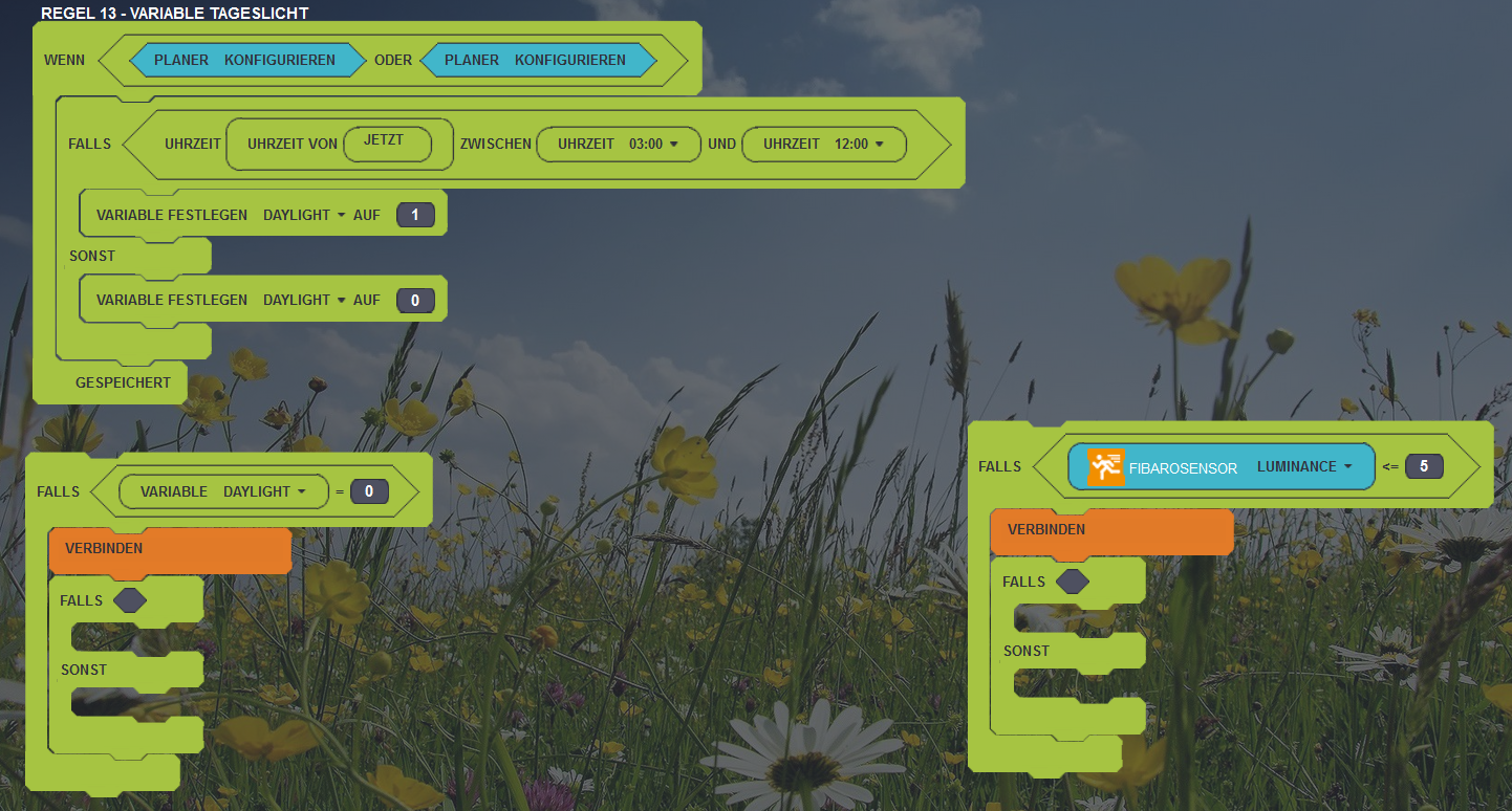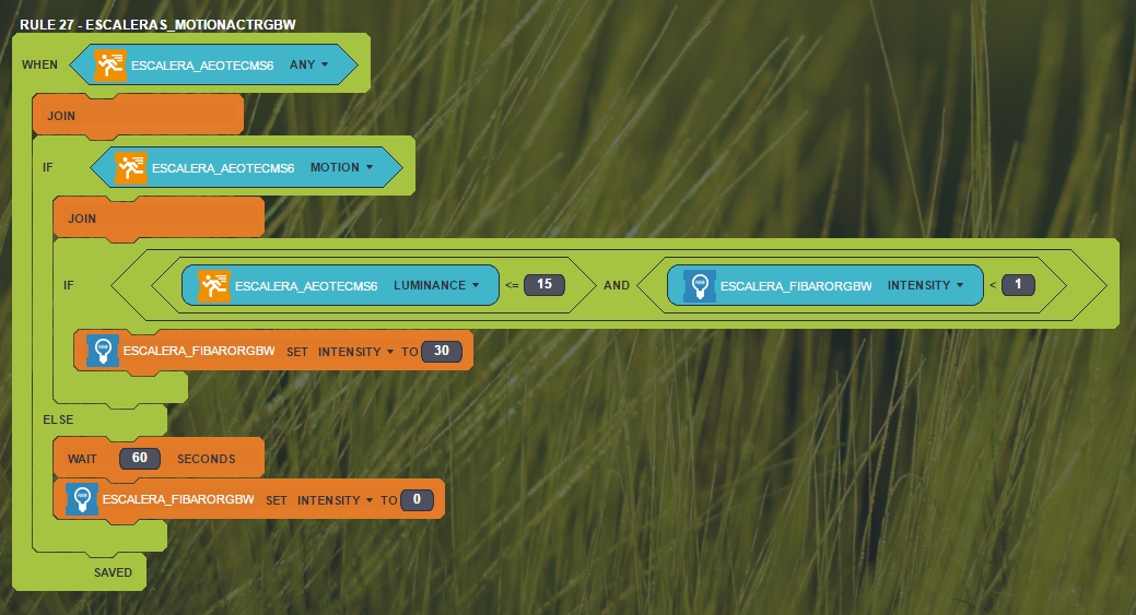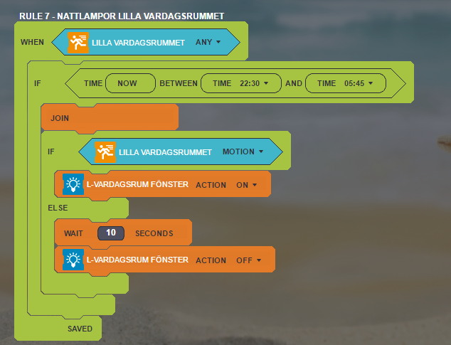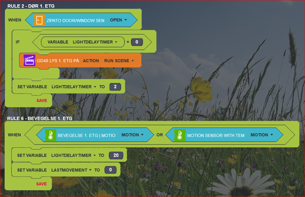 I have enclosed the rules I have for a location: Whenever the door is opened, light turns ON and a timer is set for 3 minutes. If motion is detected while light is ON, the timer resets to 20 minutes. If the timer reaches 1, light is switched off. This means that the light turns OFF 3 minutes after the last person leaves the area, but that the light stays ON as long as there is movement within 20 minutes of the last movement.