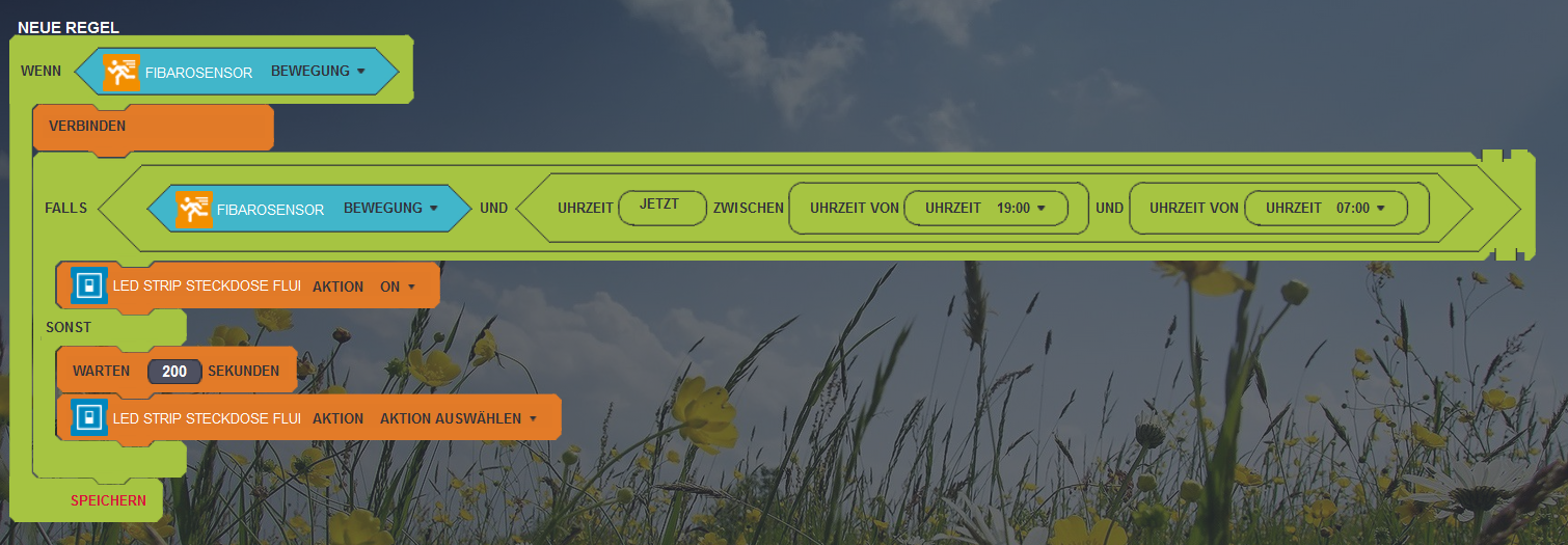 Inside this you will check that Hour of NOW > 19 or Hour of NOW < 7. If so, you will check if MotionTimer < 1. If so you will switch ON the light. (there's no need to switch on again at every motion).