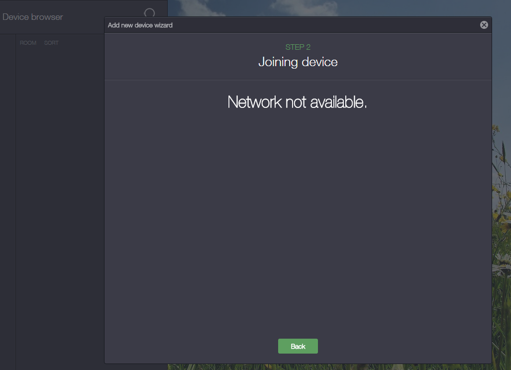 On a completely fresh box (new from the shop, or just reset to facroty default) I have problems adding the first device. I get "Network not available" when adding a device (see screenshot). This happens with all devices. I have tried to add virtual devices, nexa and other devices.