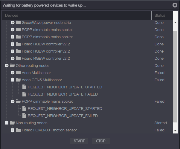 Is anyone familiar with the output in the attached screenshot? Should I suspect that the POPP dimmer is out of reach since it's neighbor update failed, or is it not recognized as a routing device at all? Would it be better to move it close to another device while performing the network heal and then move it back to its proper location?