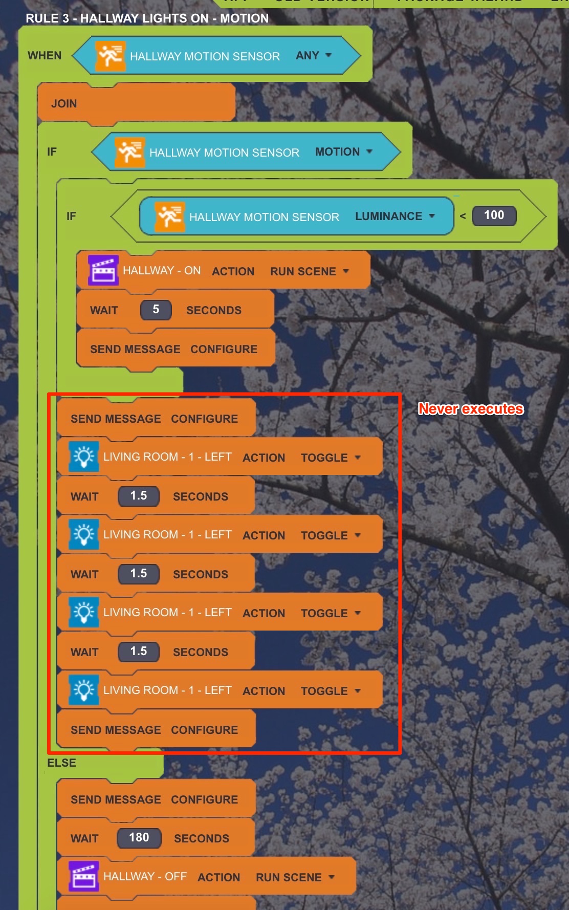 At the same time I want some lights in the living room to blink when motion is detected (i.e. independent of luminance level in the hallway). The part in the rule where I do this is never executed however (see attachment).