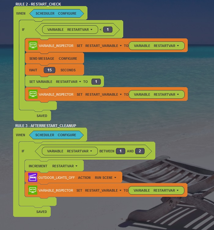 Hi, I have a scheduler that sets the value of a variable to 1, if it is 0. And then another that checks if the variable is between 1 and 2. If it is, the variable is incremented, and my outdoor lights are turned off. So after a few runs, the Variable goes to the value 3, and then never enters the rules again. But at a restart, all variables are automatically set to 0, and hence it is detected again. See attachment. (The Variable_Inspector is a virtual meter, to be able to follow/trace how it is working, as there are no debugging options).