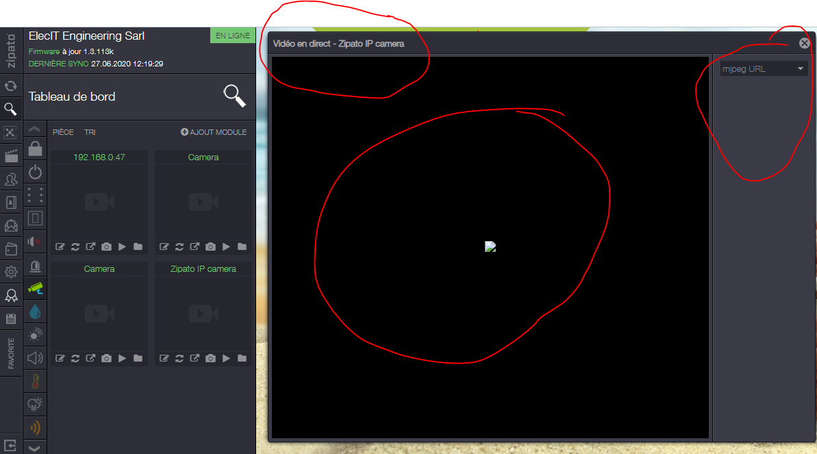 J'ai connecté tous les équipements au même réseau (caméra ip zipato, la tablette zipatile et mon pc), la zipatile détecte l'ip de la caméra, j'ajoute, le flux ne fonctionne pas, il ne s'affiche pas. et je respecte les instructions du catch00001.