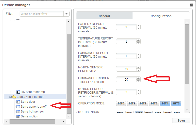 "Z-wave configuration settings" section, configuration option number 4; "Light threshold".