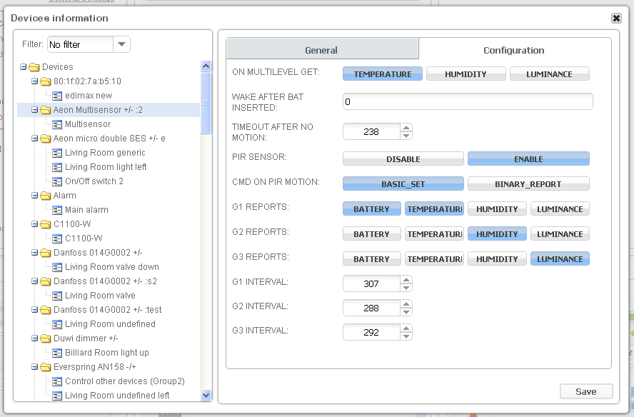 My message to Aeontech :I just bought a multisensor and I associated it to my Zipabox.The reporting is OK for Temperature, Humidity and Battery, but something weird happens with the Motion sensor.Indeeed, I receive false ”MOTION” at every wake up interval.For example today (nobody at home, sensitivity at around 50%) :